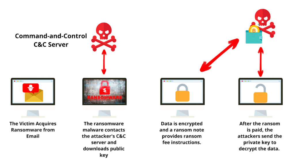 The following step is delivering the payload of the ransomware. The files are encrypted, backups are erased, and data occasionally gets exfiltrated to remote servers. Once harm is done, the victim receives a ransom notice, often with instructions on how to pay in cryptocurrency.